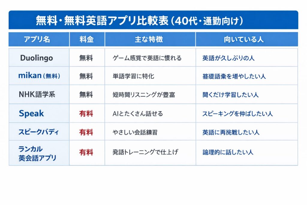 無料・有料英語アプリまとめ比較表(40代・通勤向け)