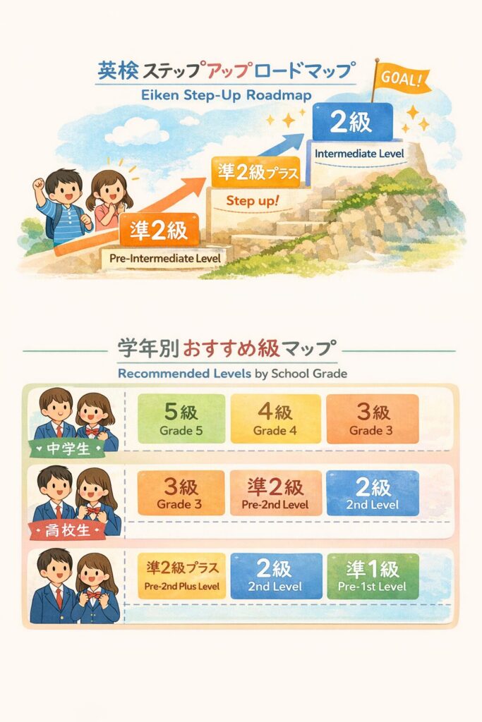英語学習で一番大切なのは「自分はできる!」という自信です。2級に落ち続けてやる気をなくすよりも、準2級プラスにしっかり合格して「次は2級だ!」と前向きになるほうが、結果的に2級合格への近道になります。