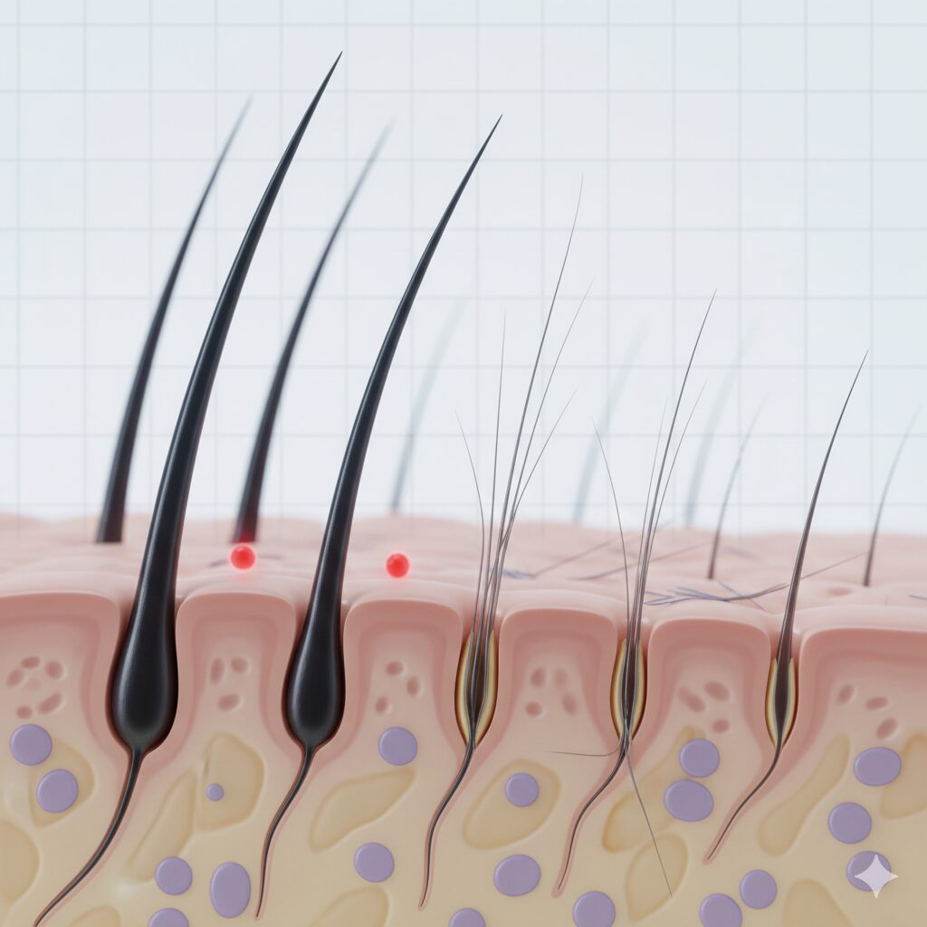 - 弱った髪: 細く短く、頼りない。地肌が透けて「スカスカ」に見える。